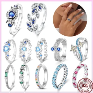 خاتم نسائي 925 فضة حلو القوس الباردة الأزرق على شكل قلب الزركون على شكل نجمة خاتم الزفاف مجوهرات رومانسية