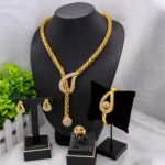 طقم مجوهرات نسائية مطلية بالذهب عيار 24 من دبي، بتصميم كلاسيكي، يتضمن قلادة وأقراط وسوار وخاتم، مناسب للحفلات والمناسبات الرسمية.