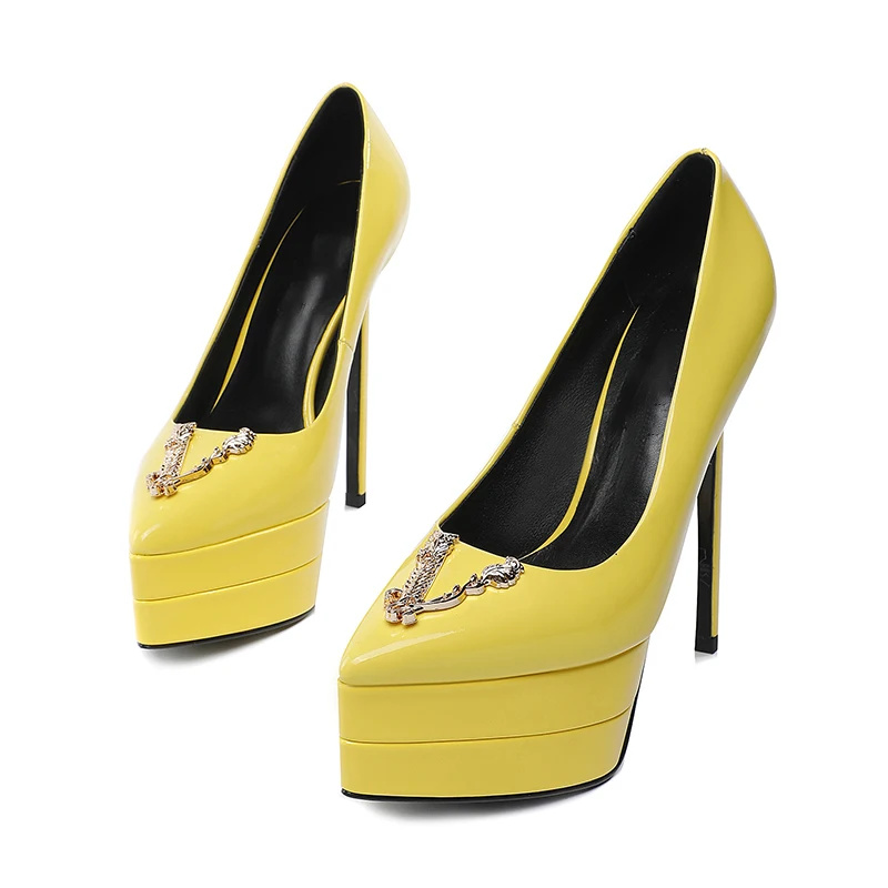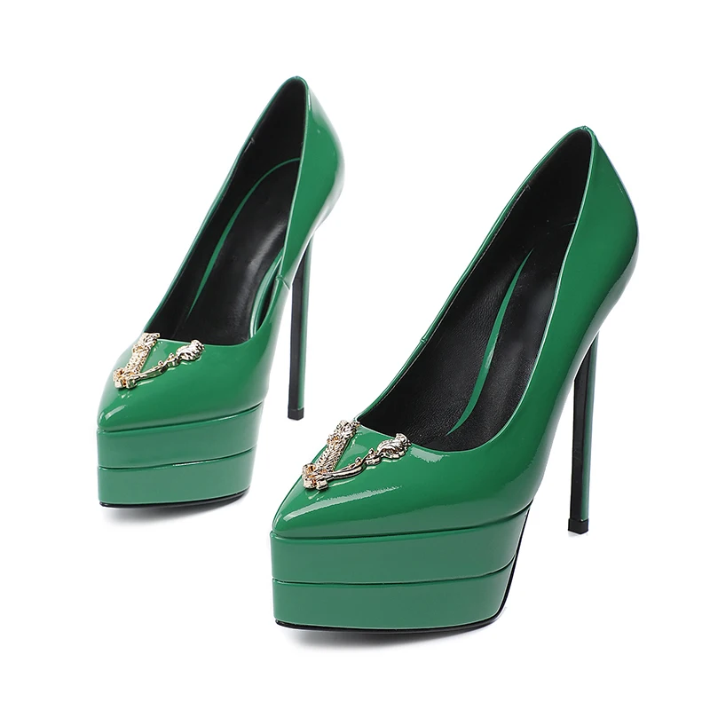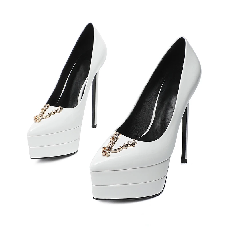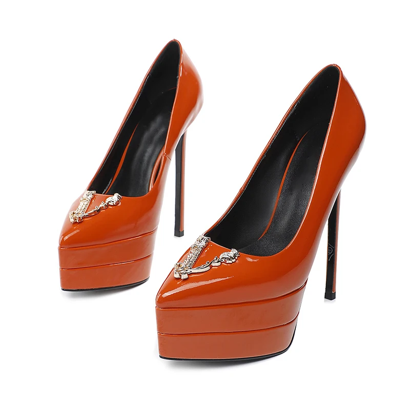 Features of the shoes: slip-on shoes,The heel is 15 cm high,High heeled sandals,Collocation bag,Brand new shoes,Metal decoration,Solid color,High Heels,Genuine Leather,Patent leather,Waterproof platform 4CM,Cowhide,slip-on shoes,Shallow mouth