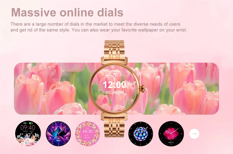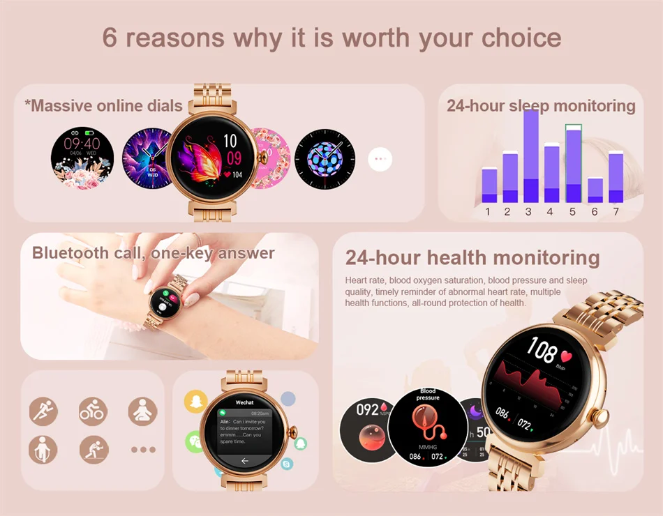 ساعة أنيقة نسائية بشاشة صغيرة وشاشة AMOLED عالية الدقة مقاس 1.04 بوصة شاشة بدقة 454*454 بكسل، حتى مع حجم 1.04 بوصة، تظل الشاشة واضحة للغاية، ويمكن إزالة الحزام المعدني لتعديل المقاس. هيكل معدني متين، مناسب للرياضات اليومية، لا يخشى الصدمات، يتحمل الوزن الكامل، وملمسه فاخر! مراقبة صحية فورية، سواء أثناء النوم أو ممارسة الرياضة، تحافظ على صحتك دائمًا! عدد كبير من أوضاع الرياضة: الجري، المشي، تنس الريشة، التنس، كرة السلة، تنس الطاولة، ركوب الدراجات، اليوغا، نط الحبل، المشي لمسافات طويلة، الجري الداخلي، جهاز الإليبتيكال، جهاز التجديف، الدراجة الهوائية، دراجة التمرين، البيسبول، الرجبي، الكريكيت، تمارين القوة (يمكن للتطبيق إضافة مئات الأوضاع). تطبيق “FitCloudPro” التطبيق: تطبيق مستقر. اتصال واحد، وظائف أكثر شمولاً، تجربة مستخدم مميزة، إعدادات ساعة متكاملة!