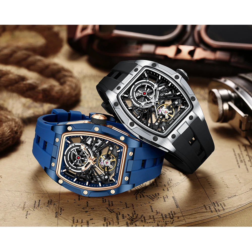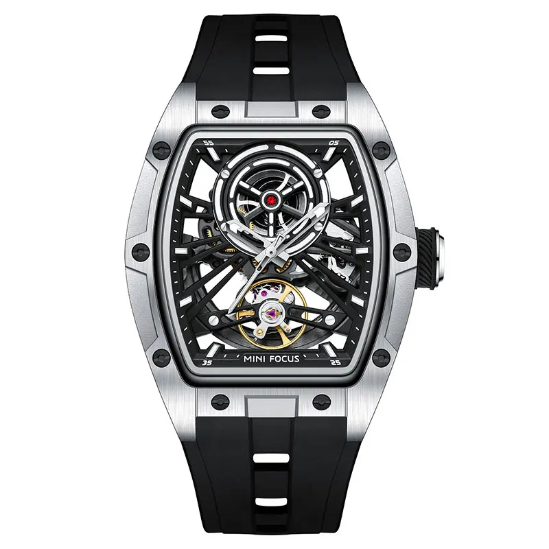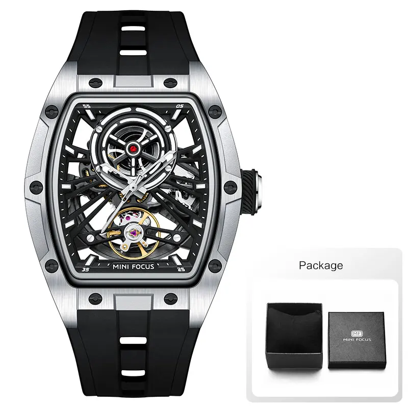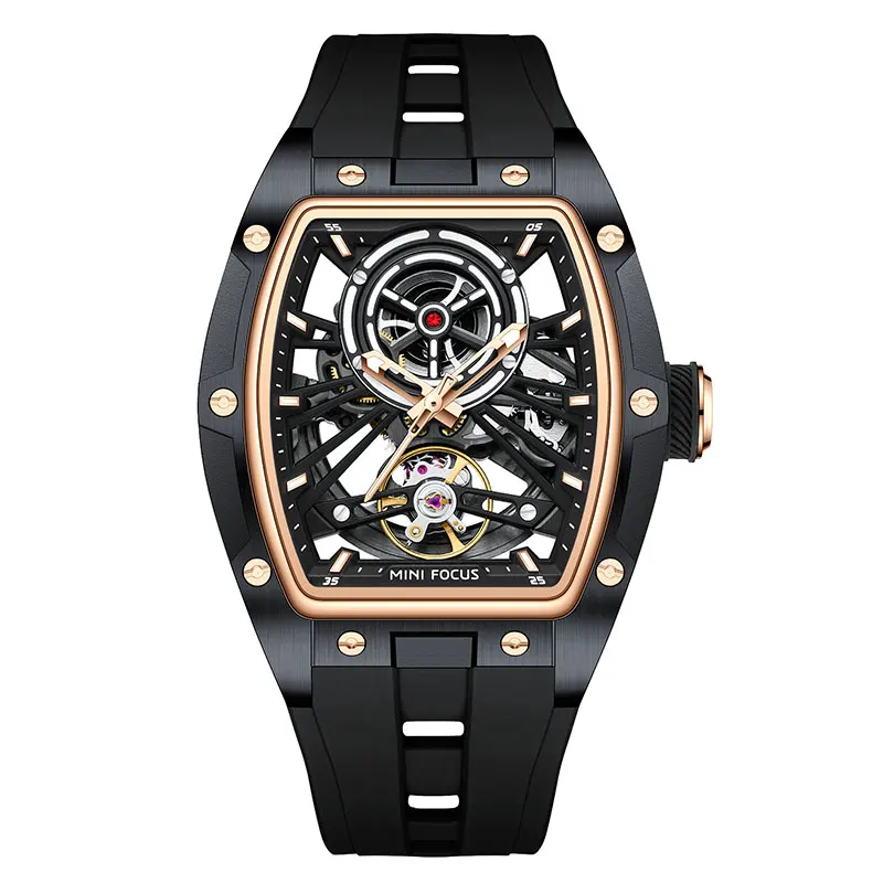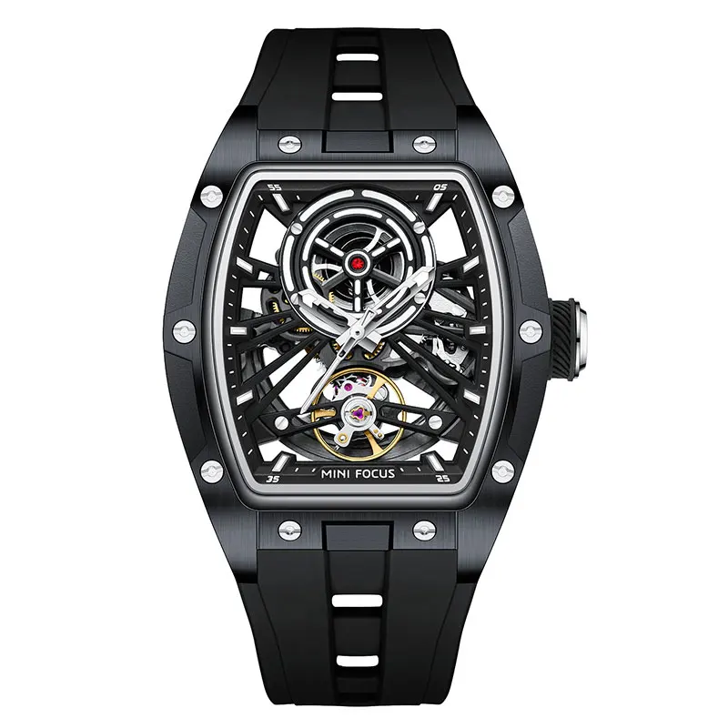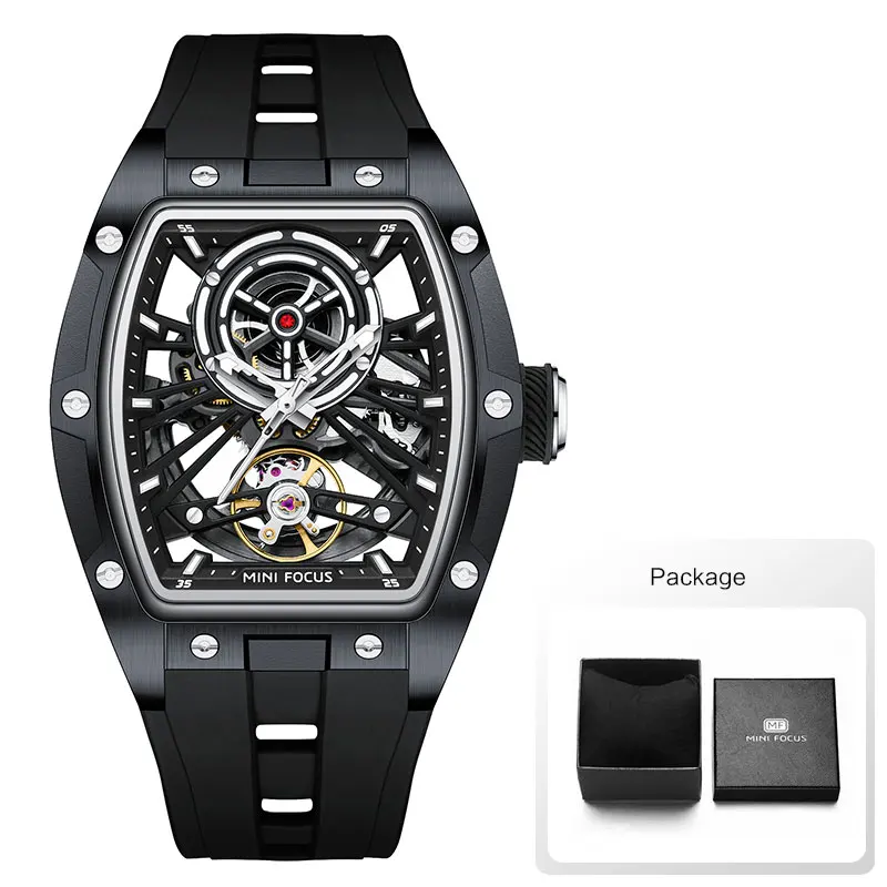 ساعة يد رجالية من MINI FOCUS، ساعة ميكانيكية أوتوماتيكية مقاومة للماء باللون الأسود مع أيدي مضيئة وحزام من السيليكون ومينا تونيو