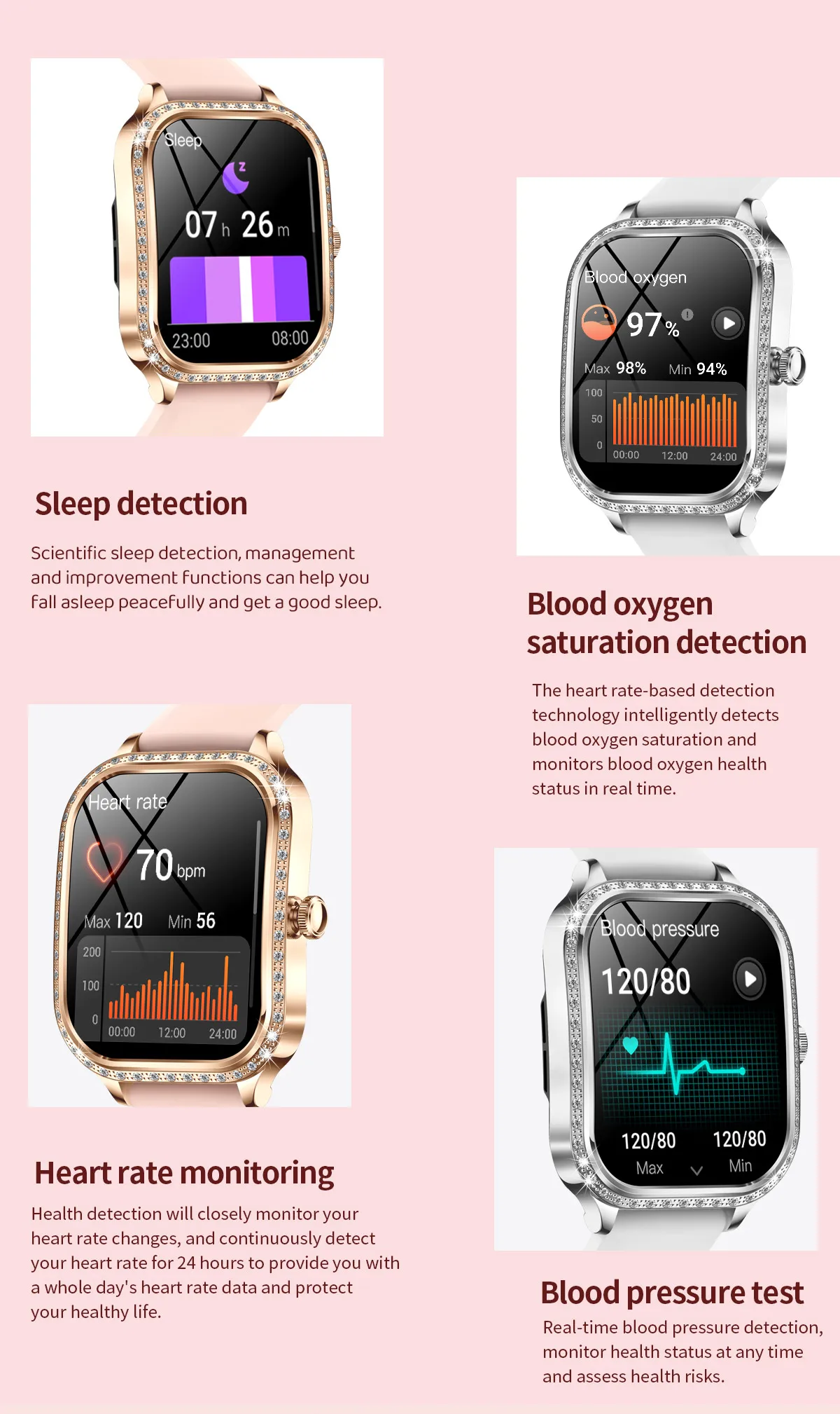عداد الخطوات، مسافة التمرين، استهلاك السعرات الحرارية، كشف معدل ضربات القلب، كشف ضغط الدم، كشف نسبة الأكسجين في الدم، توقعات الطقس، مساعد صوتي، مكالمات بلوتوث، موسيقى بلوتوث، وضع رياضي متعدد، تذكير برسائل وسائل التواصل الاجتماعي، كشف النوم، ساعة توقيت، مؤقت، منبه، تمارين التنفس، العثور على الهاتف، تذكير بالجلوس لفترات طويلة، منبه ذكي، تذكير فسيولوجي للنساء، ألعاب مصغرة، إلخ. SimSun;font-size:14px;font-weight:400;letter-spacing:normal;text-align:start;white-space:normal;margin:0px;margin-bottom:0px;margin-top:0px;margin-left:0px;margin-right:0px;padding:0px;padding-bottom:0px;padding-top:0px;padding-left:0px;padding-right:0px” class=”detailmodule_text” align=”start”>