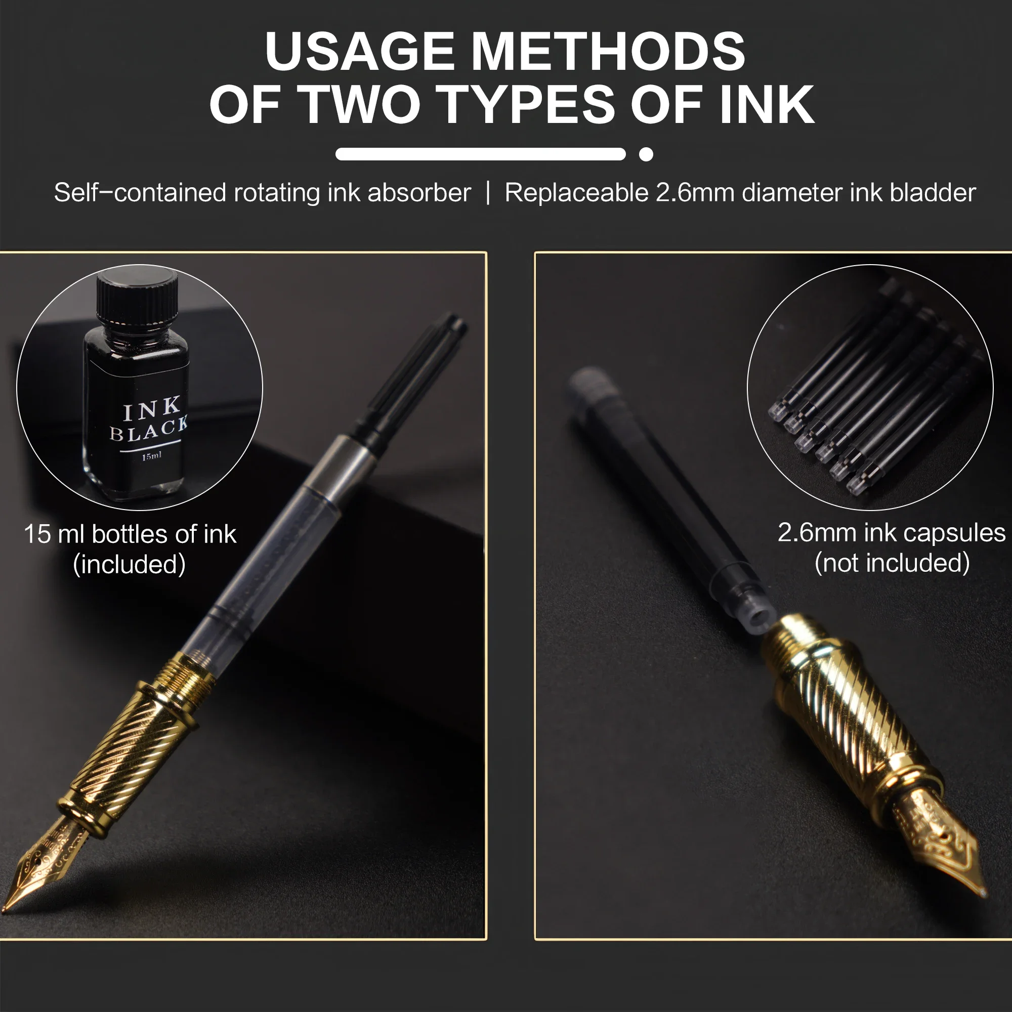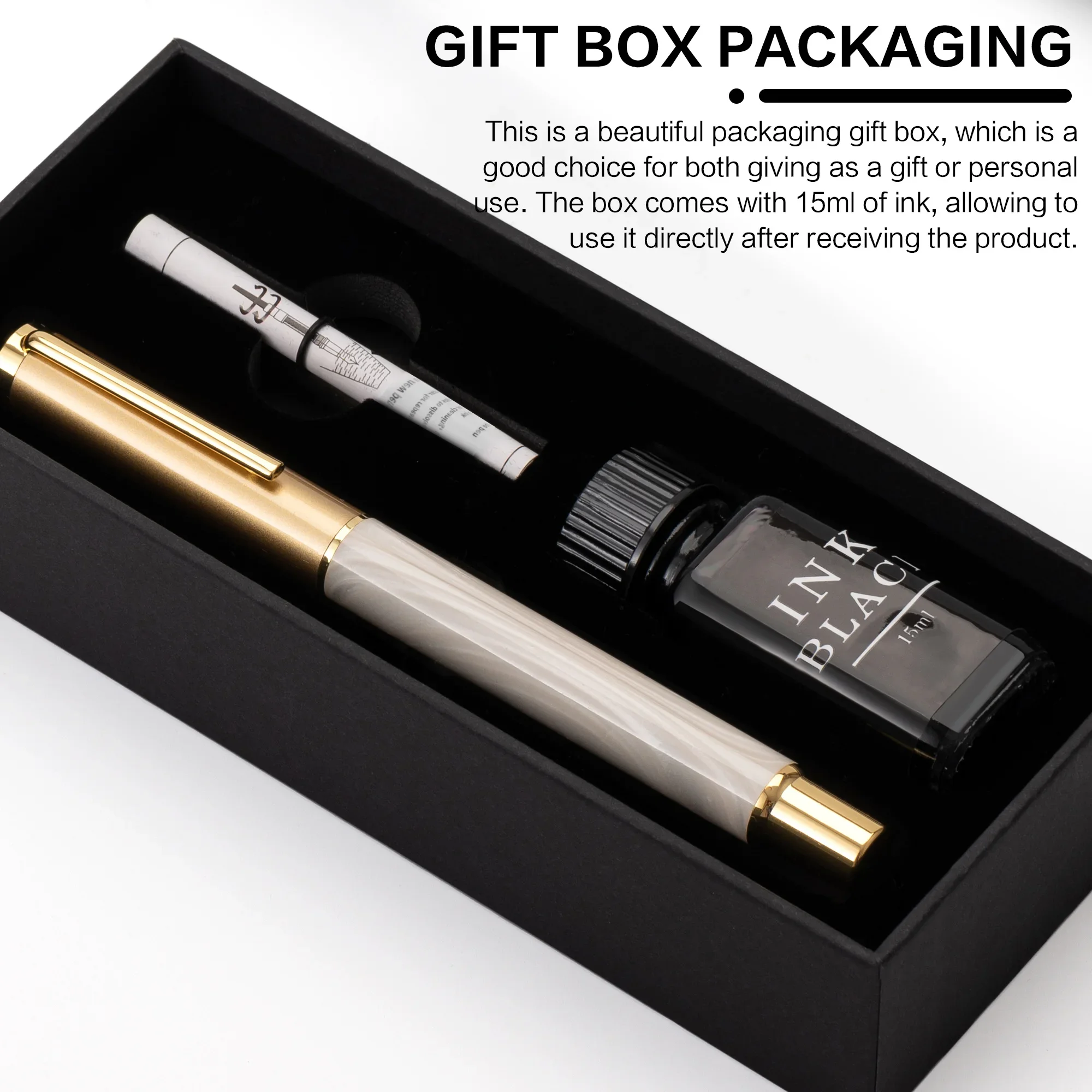 هدية رائعة – أقلام الحبر هدية أنيقة للمحترفين الجدد والمحترفين، والمدراء، والمسؤولين التنفيذيين في جميع المجالات. علبة هدايا فاخرة، تجعلها هدية مميزة لك، أو لعائلتك، أو لأي شخص آخر. لا تنسَ أن كل قلم يأتي مع زجاجة حبر سعة 15 مل لتتمكن من الكتابة فورًا.