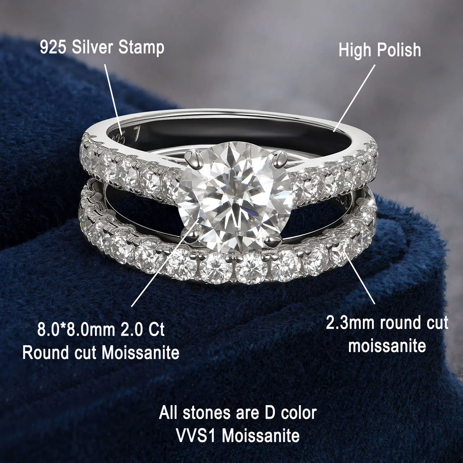 طقم خواتم زفاف من الماس المويسانتي عيار 2 قيراط معتمد من نيوشي للنساء، مصنوع من الفضة الإسترليني عيار 925، بتصميم دائري لامع، خواتم خطوبة فاخرة