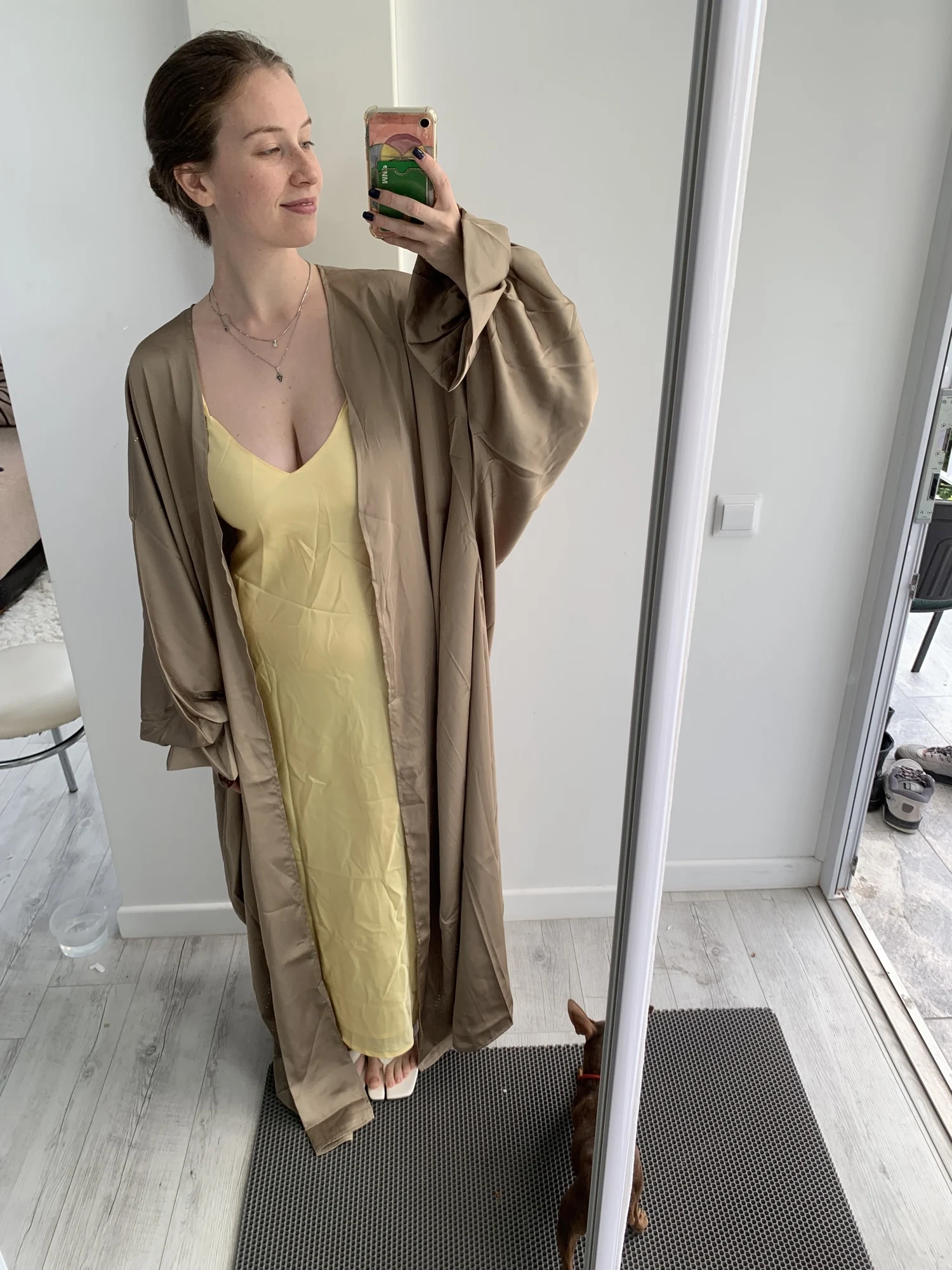 عباءة مذهلة، لكنها طويلة جدًا وكبيرة الحجم بالنسبة لي. من الأفضل أن تأخذ أقل إذا كانت المعايير مثل معاييري. لشكلي 90/73/90 بارتفاع 168 سم.