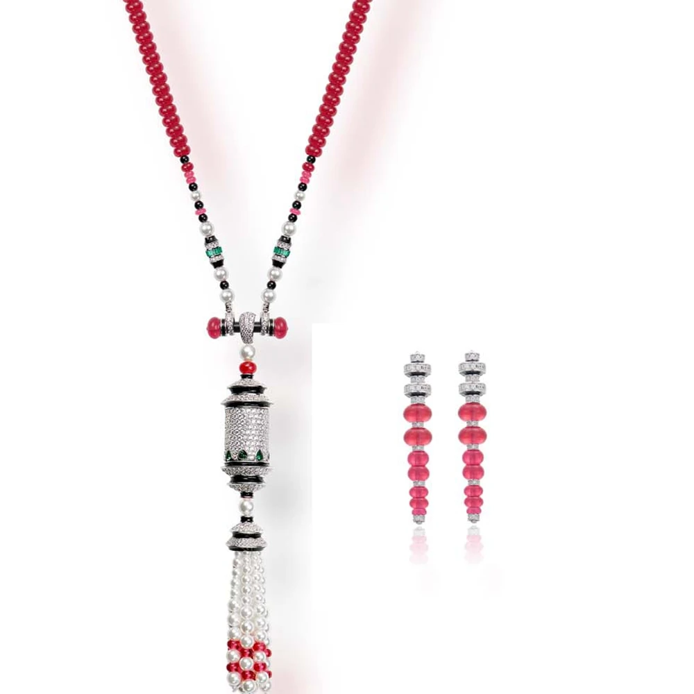 قلادة طويلة من الخرز، مطلية بالمينا السوداء، مزينة بعقيق أحمر، زركون أخضر، ولؤلؤ أبيض، مع شرابة. سلسلة من الخرز. قلادات وأقراط