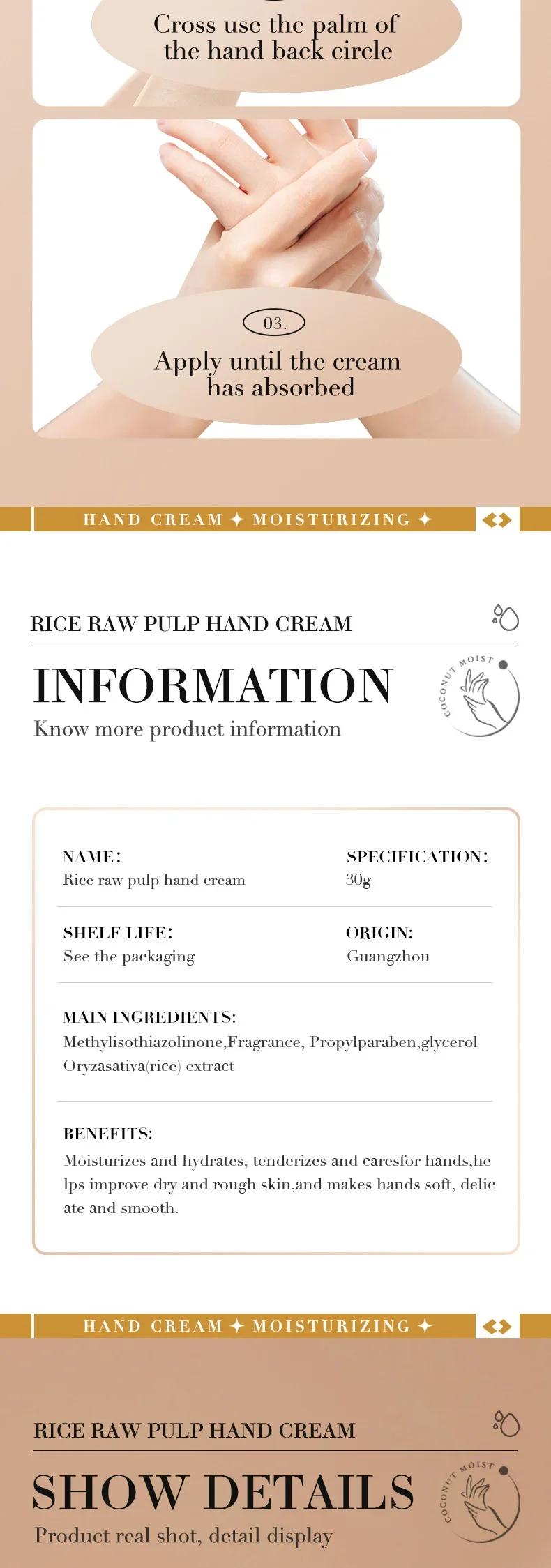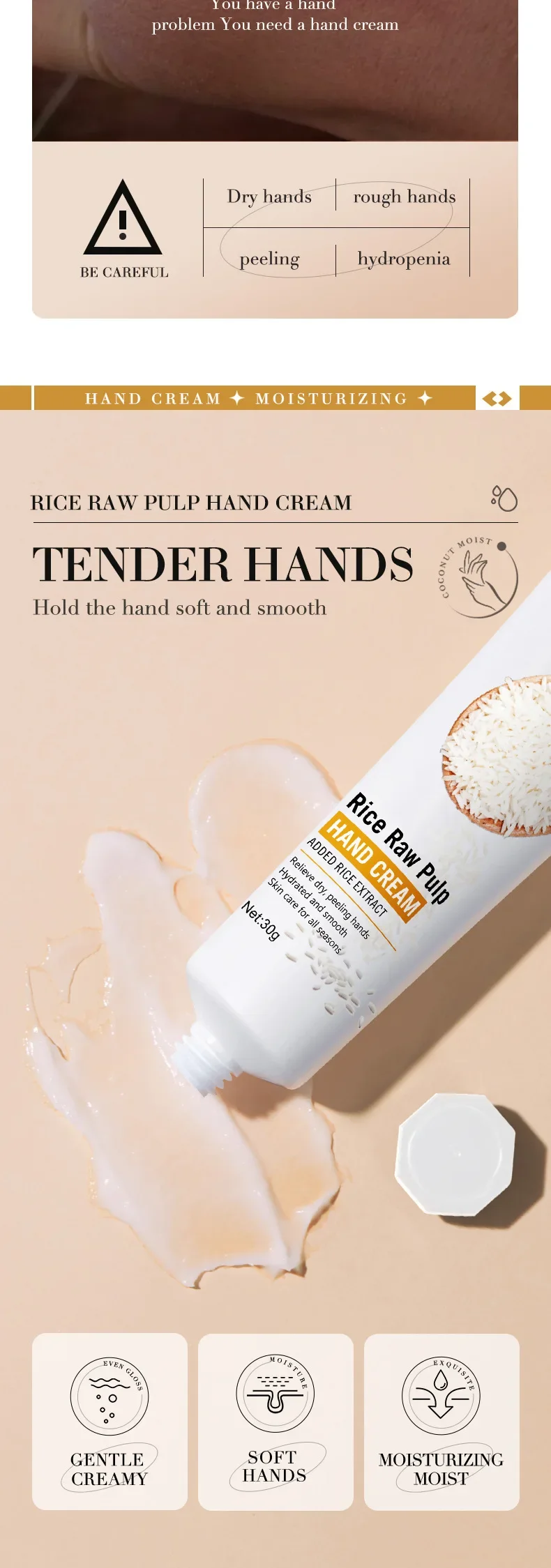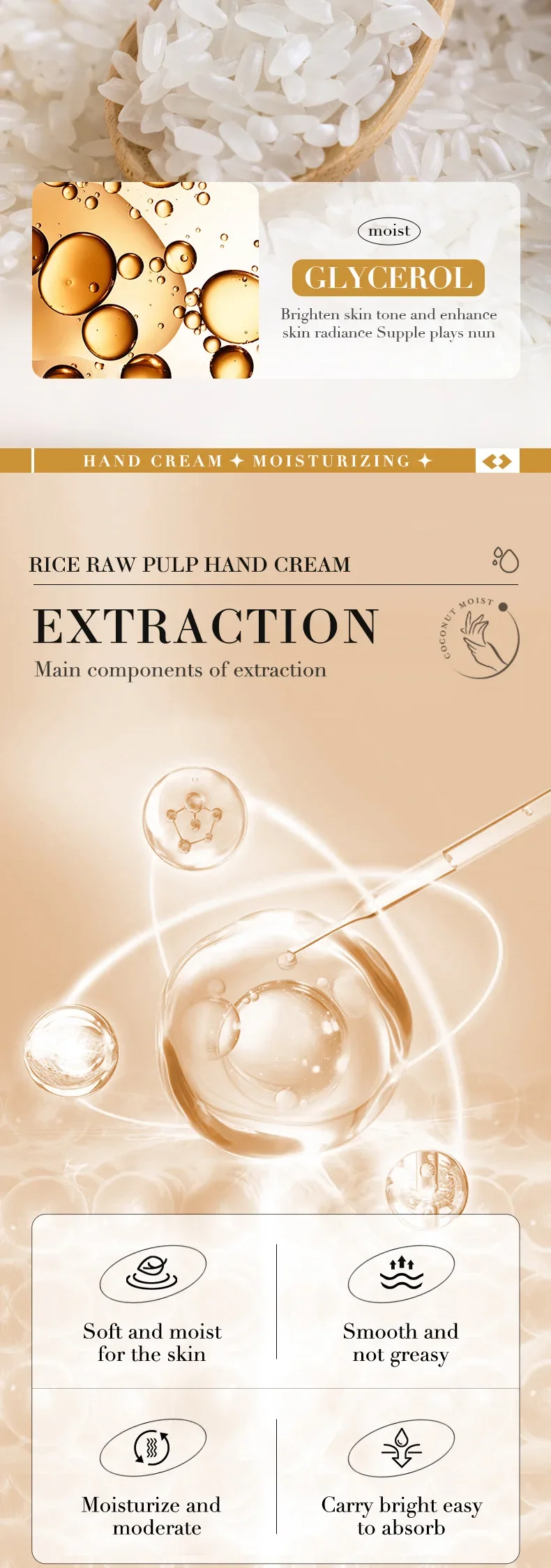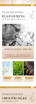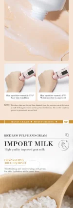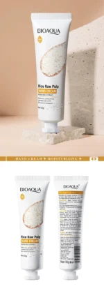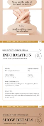 1. مكونات طبيعية: كريم اليدين هذا غني بالعديد من العناصر الغذائية المستخلصة من لب الأرز الخام، مما يرطب وينعم بشرتك دون تهيجها أو تحفيزها.