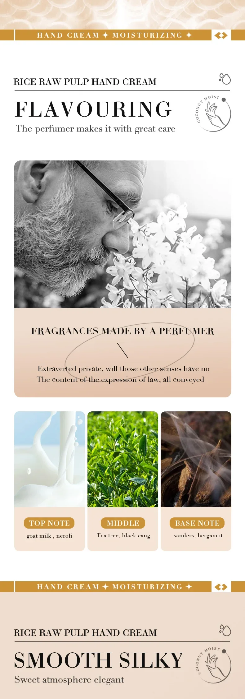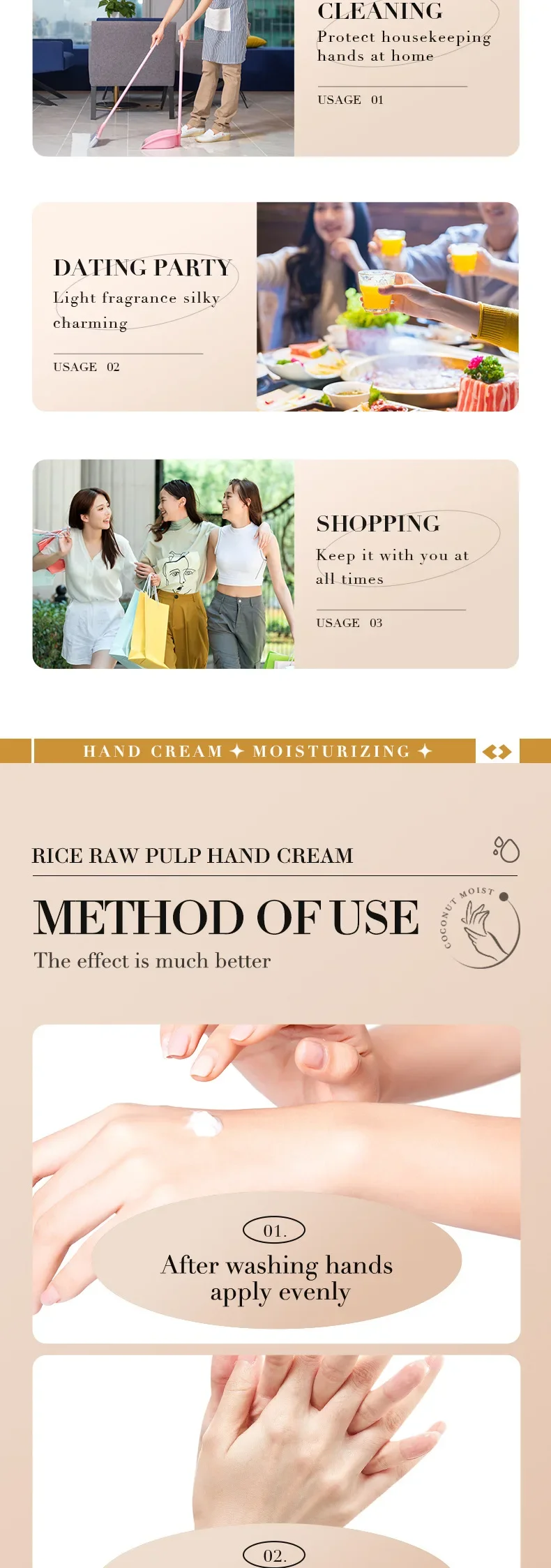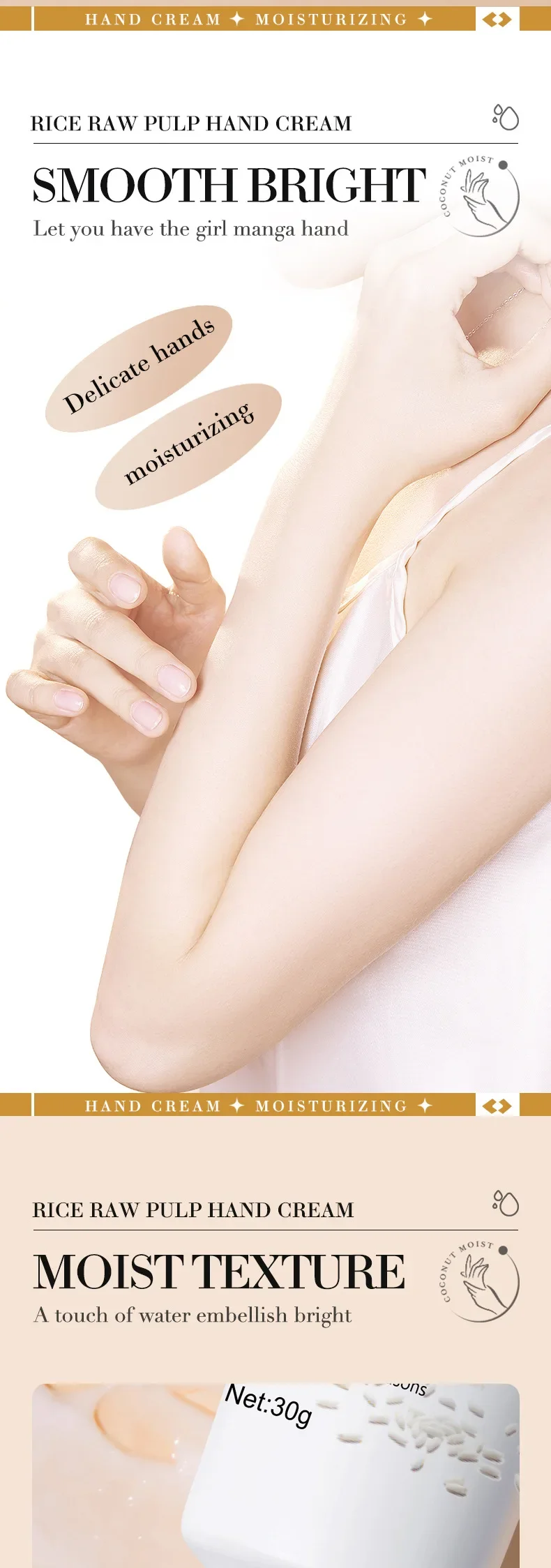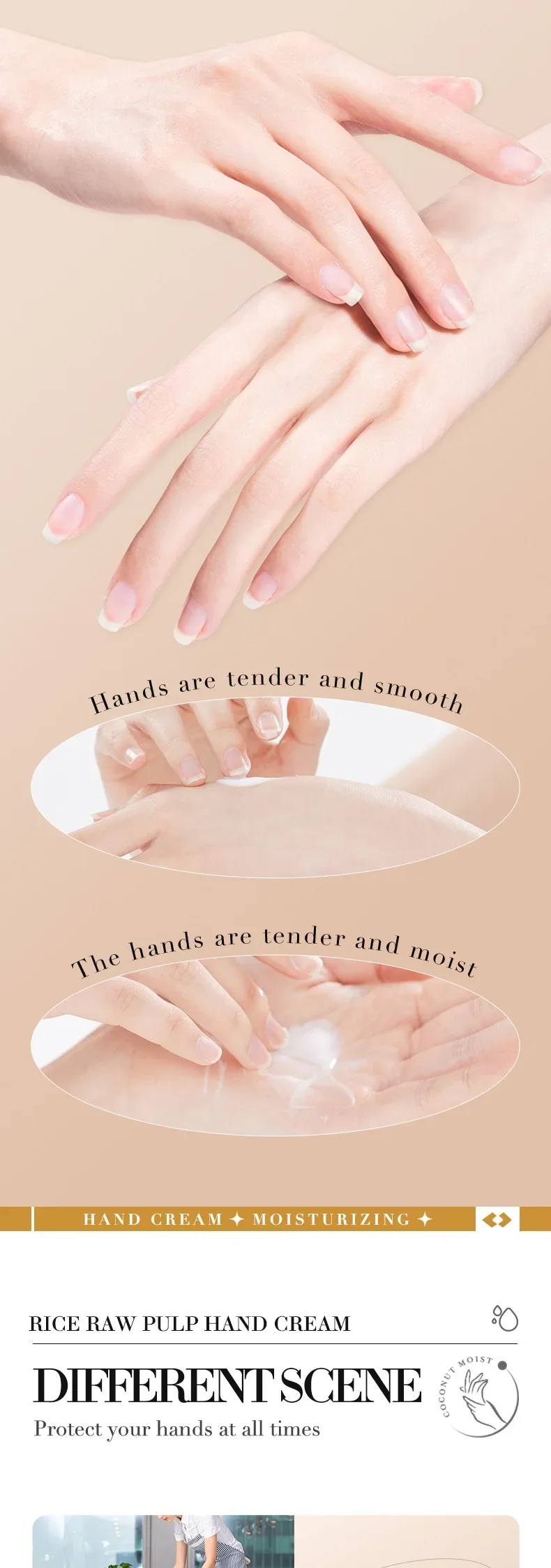 1. مكونات طبيعية: كريم اليدين هذا غني بالعديد من العناصر الغذائية المستخلصة من لب الأرز الخام، مما يرطب وينعم بشرتك دون تهيجها أو تحفيزها.