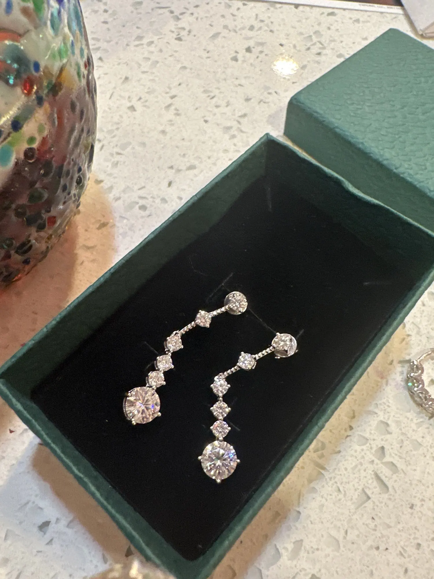 إنها أقراط جميلة وكانت هناك أيضًا شهادة مدرجة. إنها تتألق حقًا بشكل جميل وتأتي في علبة جميلة. هذا متجر رائع حقًا.